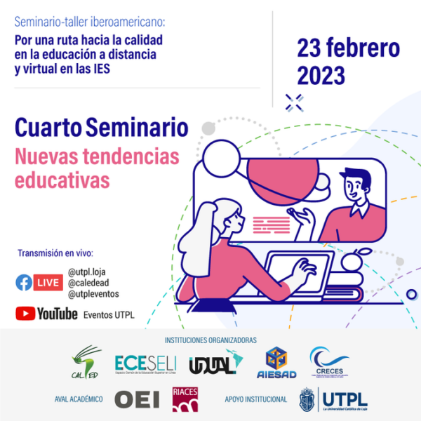 No te olvides la siguiente semana se desarrollará el Cuarto Seminario “Nuevas tendencias educativas”. Organizan: CALED, @eceseli_udual, @UDUALC, @aiesad_org, CRECES, @EspacioOEI, @riaces_org y @utpl