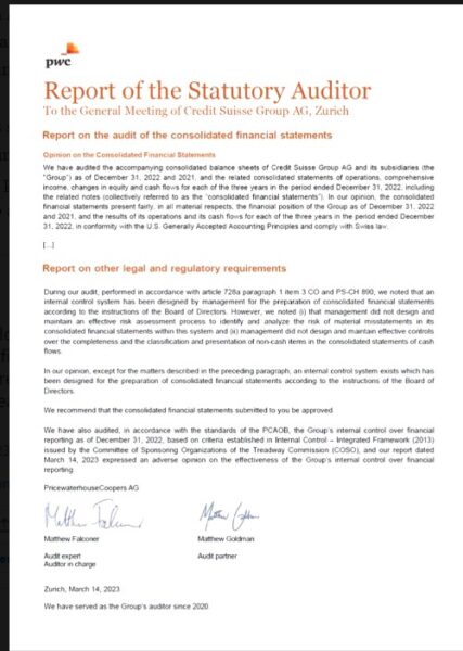 Credit Suisse would like to reiterate, as announced this morning, our financial results for 2022 and preceding years are accurate and reliable, as supported by a clean audit opinion by our external auditor, PwC.
