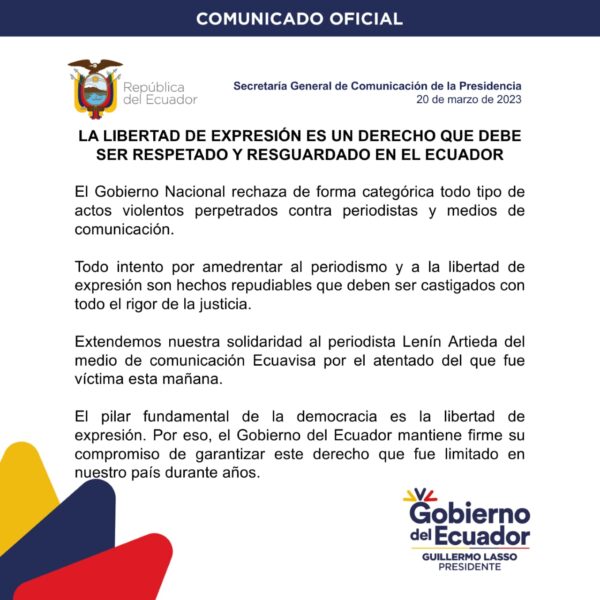 En un comunicado oficial de la Secretaría General de Comunicación de la Presidencia, el Gobierno Nacional rechaza de forma categórica todo tipo de actos violentos perpetrados contra periodistas y medios de comunicación.