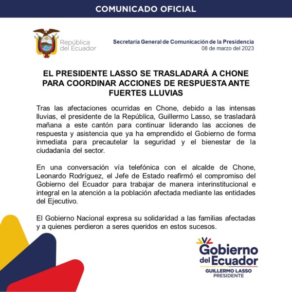 La Secretaría General de Comunicación de la Presidencia indicó que el jefe de Estado conversó con el alcalde de Chone, Leonardo Rodríguez, para poder atender “de manera interinstitucional e integral” a la población perjudicada.