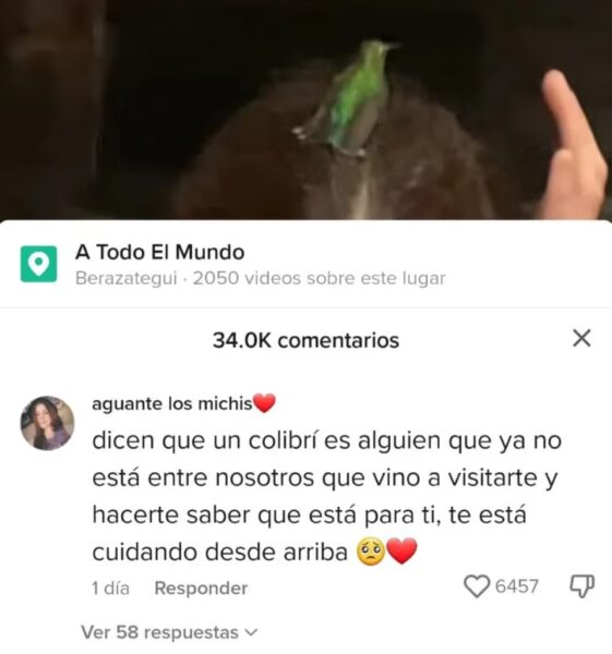 “Los colibríes dicen que son seres queridos perdidos que te vistan. A mí me pasó regando las plantas en el patio. Es hermoso. Lloré muchísimo ese día”, escribió una usuaria. Tras ver este mensaje, la protagonista del video viral le respondió y afirmó que ella vivió la misma vivencia. “Yo igual, sabía que era mi perrita visitándome, yo le pedí una señal”, sostuvo.