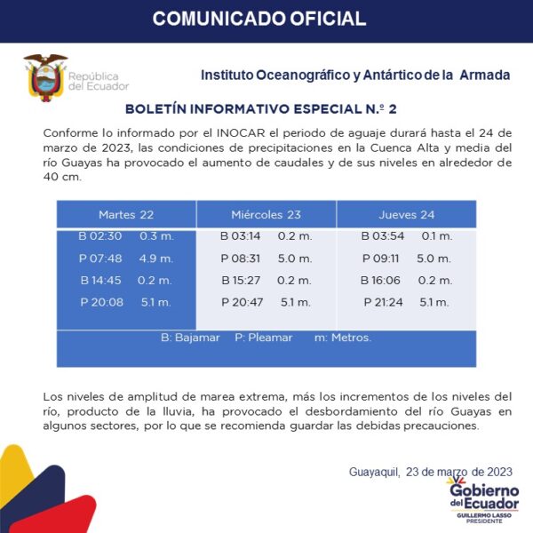 “Los niveles de amplitud de marea extrema, más los incrementos del caudal del río Guayas, producto de la lluvia, han provocado el desbordamiento de este en algunos sectores”, se detalla. Se puntualiza que el caudal del río se incrementó 40 centímetros.