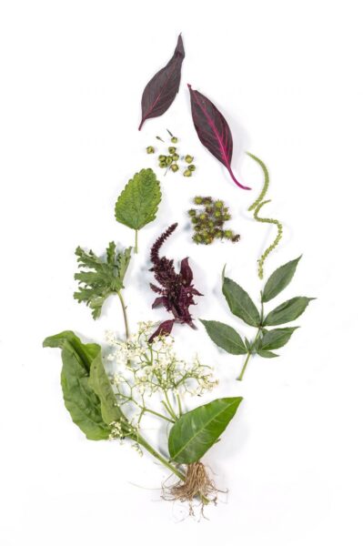 Algunas de las 61 plantas que pueden componer la receta de la horchata lojana como son: Escancel, llantén, linaza, toronjil, cadillo, ataco, esencia de rosas, flor y hoja de tilo y hoja de naranja.