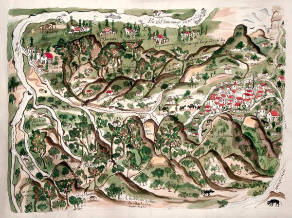 Mapa en acuarela de la región de Loja en la Audiencia de Quito que representa a los recolectores de la corteza llamada cascarilla. Cortesía: Wellcome Collection.