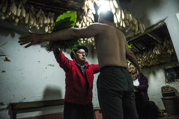 Proceso de purificación con plantas medicinales en la comunidad Saraguro. Fotografía: Javier Vázquez.