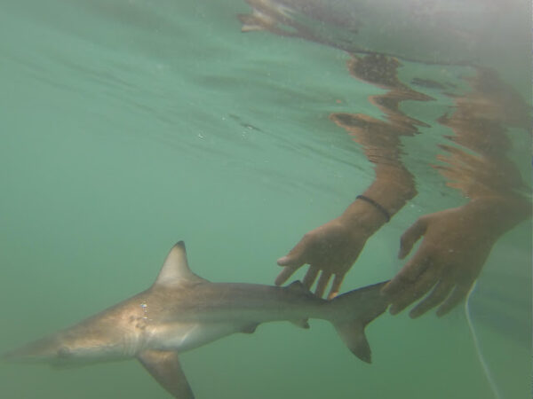 La investigadora Yasuní Chiriboga liberando un juvenil de tiburón puntanegra luego de haber tomado sus signos vitales. Foto: Alex Hearn.