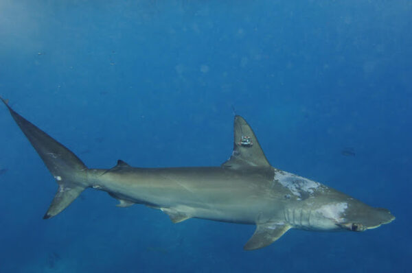 La marca satelital en este tiburón martillo permite rastrear sus movimientos desde la Reserva Marina Galápagos a otras partes de la región. Foto: Pete Oxford.