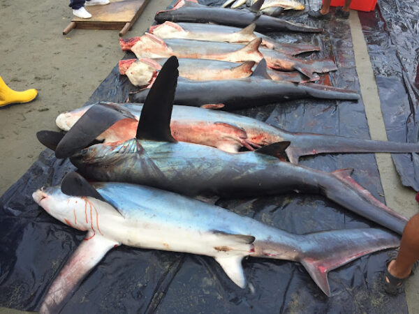 El aleteo en altamar está prohibido, y los tiburones deben ser desembarcados enteros. Las aletas son removidas apenas llegan a la orilla. Foto: Alex Hearn.