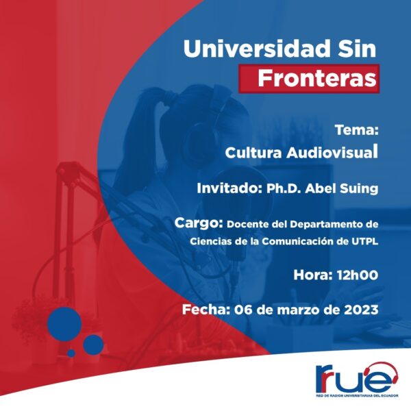 Este lunes la Universidad Técnica Particular de Loja invita a escuchar el programa #UniversidadSinFronteras desde la Red de Radios Universitarias del país; con el tema: Cultura Audiovisual; hablaremos con el Ph.D. @abelsuing desde la carrera de @ComUTPL