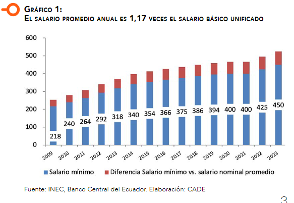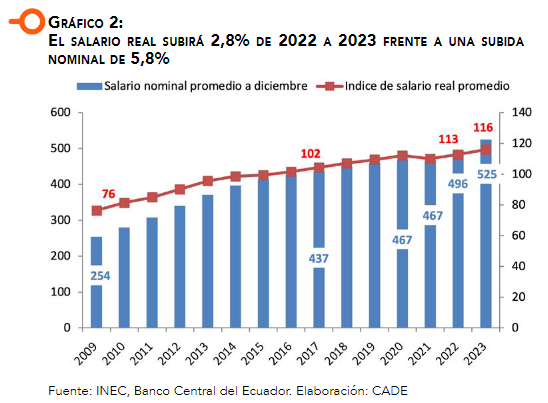 Debido a que en Ecuador hay catorce salarios al año -contando con el décimo tercero y décimo cuarto sueldos- el salario promedio mensual es más elevado que el mínimo aprobado; o sea que en 2023 el salario promedio será de $ 525 a partir de un SBU de $ 450 por mes, mientras que en 2022 el promedio fue de $ 496 a partir de un SBU de $ 425; lo que representa un incremento de 5,8% (superior a la inflación proyectada del 2,75%), tanto en el salario promedio cuanto en el SBU. El índice de salario real promedio muestra una subida de 2,6% en el 2022 y de 2,8% en 2023, lo que frente a 2014 (el año base=100), significa un incremento del poder adquisitivo de 13 puntos adicionales hasta 2022 y de 16 puntos hasta 2023.