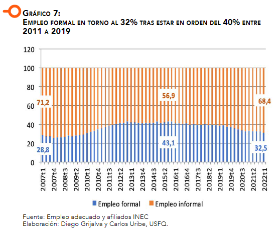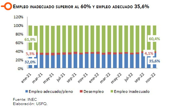 La situación del mercado laboral ecuatoriano es crítica en el sentido de que a través de los años no se logra crear una estructura en la que el empleo formal sea predominante, pues en los tiempos de mayor formalización se mantiene en torno al 40% (2012 a 2015). En los últimos cinco años el empleo formal ha fluctuado entre 19% a 28% de la PEA, con el nivel más alto en diciembre de 2017 y el más bajo en agosto 2022. Por otra parte, el empleo adecuado cerró en 42,3% en diciembre de 2017 y fue bajando sostenidamente hasta 35,5% de la PEA en diciembre de 2022. A partir de la caída del precio del petróleo a nivel internacional desde julio de 2014, el empleo adecuado se contrae para no volver a recuperarse.