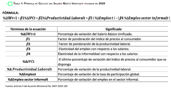 Existe una fórmula para el cálculo del nuevo salario básico unificado la cual entró en vigencia en 2020 y fue utilizada en 2020 y 2021, e ignorada para la determinación del salario en 2022 y 2023, en donde se impuso un criterio político. La fórmula recoge factores técnicos con la intención de que su aplicación esté acorde con la situación del país en cuanto a precios, a producción por trabajador, a la generación de empleo formal y hasta considera que el aumento del empleo informal debe generar una menor subida del salario. Se expresa como se observa y se explica en la Tabla 1. Los coeficientes beta son calculados por el Ministerio de Trabajo, y mientras 1 y 2 provienen de data sólida, en cambio las elasticidades del empleo formal e informal frente al salario ( 3 y 4) no tienen una trayectoria conocida ni registros históricos, por lo que su valor y su cálculo levantan interrogantes.