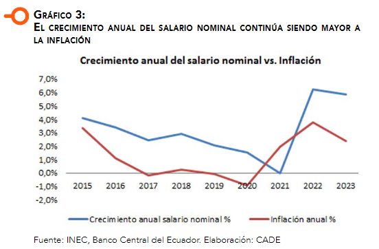 El 30 de noviembre de 2022, mediante Decreto Ejecutivo No. 611, se fijó el salario básico unificado (SBU) en $ 450 para su entrada en vigencia desde el 01 de enero de 2023, aplicable a los trabajadores en general, incluidos los de la pequeña industria, los del sector agrícola y trabajadores de la maquila, trabajador o trabajadora remunerada del hogar, operarios de artesanías y colaboradores de la microempresa. El incremento del SBU para el año 2023 respecto del año 2022 es del 5,8%, que también es aplicable para la fijación de los salarios mínimos sectoriales, y más que duplica la expectativa de inflación en 2023.