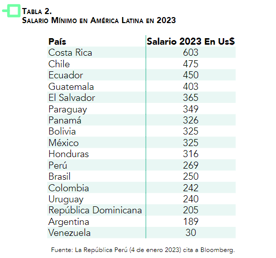Más allá de ese importante análisis, al comparar los salarios en este año en la región (Tabla 2), se observa que Ecuador está tercero ya que el salario básico unificado (SBU) es de $ 450 por mes. Esta comparación tiene la limitación de que no considera el salario promedio mensual de los países, sino el básico, para el caso de Ecuador se reciben catorce sueldos. A nivel de salario básico, en los países vecinos Perú y Colombia, el costo es 48,8% y 53,9% menor respectivamente.