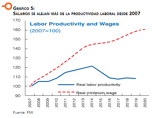 Un análisis sobre los salarios en Ecuador publicado por el FMI en 2021 compara el índice de salario real y de productividad laboral de 2007 a la fecha. La brecha creciente que se ha ido generando desde 2007 a 2020 entre los 2 factores (Gráfico 5) es una muestra más de la pérdida de competitividad en el mercado de trabajo y del divorcio entre factores técnicos y políticos. En 2021 y en 2022, esta brecha se amplió aún más, como se observa en el gráfico seis del siguiente subtítulo. La productividad aquí se calcula dividiendo el PIB para las personas empleadas y a partir de ello se genera un índice de productividad con base en 2007=100.