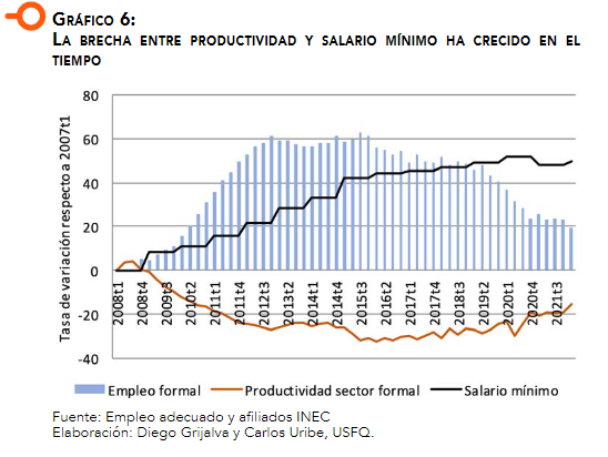 En el estudio “Economía y Empresas Sostenibles en el Ecuador post pandemia” de los profesores de la Universidad San Francisco de Quito, Diego Grijal-va y Carlos Uribe, publicado en la revista EKOS en agosto de 2022, los autores afirman que “la política salarial ha generado rigidez en el mercado laboral que se ha convertido en un problema estructural”. Hacen un cálculo del índice de productividad del sector formal y del índice de salario real, y muestran la trayectoria alejada de estos dos factores (Gráfico 6). El empleo formal está medido como el número de trabajadores que aporta a la seguridad social (IESS) y se encuentra trabajando, la cual sigue la tendencia del empleo adecuado. La productividad del sector formal está medida como la relación entre el PIB y el número de trabajadores afiliados al IESS; a partir de ese indicador se calcula el índice de productividad del sector formal con base 2008=100, que es la línea roja en el gráfico 6.
