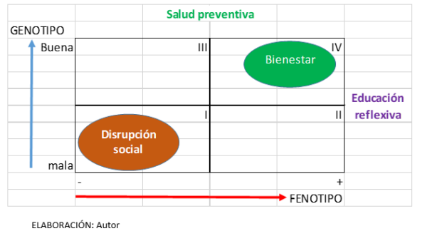 Vamos a considerar, en un mundo ideal, que en el comportamiento humano existen dos constantes, fruto de buenas políticas públicas permanentes en el tiempo: salud preventiva (SP) y educación reflexiva (ER) y que las variables que se modifican son: Genotipo, con escala de mala a buena y Fenotipo, con escala de negativo a positivo. De conformidad con la gestión, como sociedad aspiramos alcanzar el bienestar, cuadrante IV, no sin antes haber experimentado el aprendizaje reflexivo al pasar por los cuadrantes II y III. Es decir, nuestra constitución genética completa, que nos han transmitido de generación en generación (Genotipo) y nuestras características físico-bioquímicas y el comportamiento observable (Fenotipo), son los elementos fundamentales para junto a las políticas públicas buscar el bienestar. Al recibir del estado la educación y la salud adecuadas, buscaremos actuar de forma buena creando un entorno positivo (cuadrante IV = bienestar). Desviaciones de esta calidad de linaje y del comportamiento adecuado implicaría en el peor de los casos la disrupción social pues la estirpe es mala y el comportamiento negativo (cuadrante I).