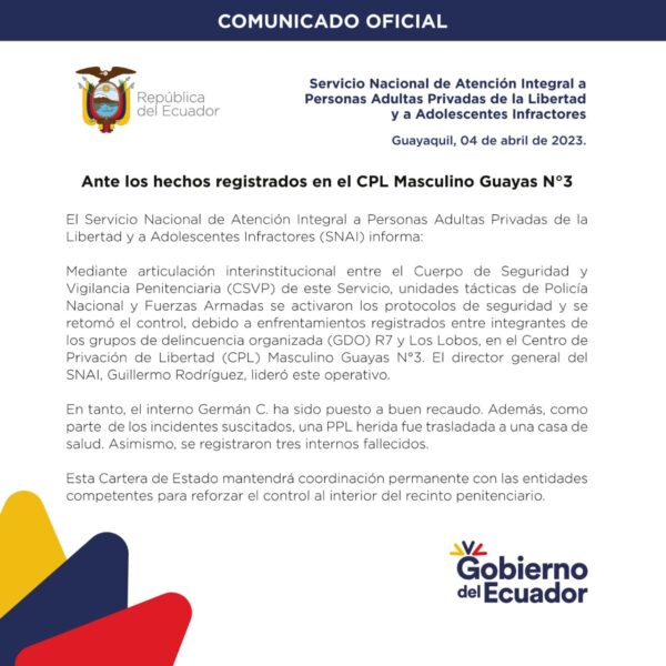 Tres reclusos muertos y uno herido es el saldo del enfrentamiento armado suscitado este martes 4 de abril en la cárcel de máxima seguridad La Roca, ubicada en la Vía a Daule, en Guayaquil.