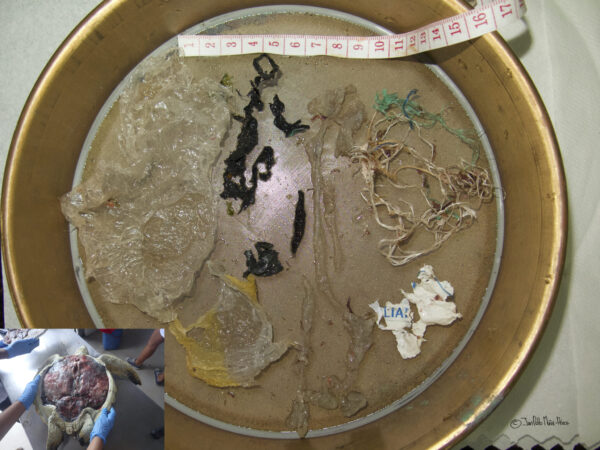 En las fotos que comparte, se ve a las tortugas nadando con bolsas plásticas que cuelgan de su cuello, mientras que otras las tienen en su boca y se resisten a soltarlas. En algunas imágenes, en cambio, se observa el plástico que se removió del organismo de estos animales.