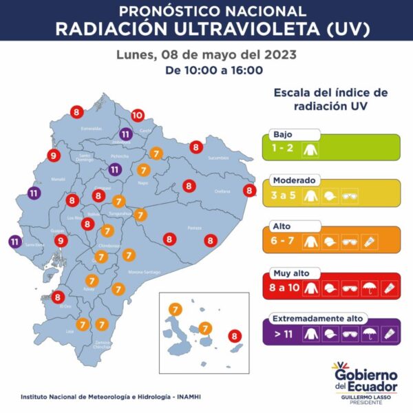 Durante la jornada de este lunes, 8 de mayo de 2023, los índices de radiación UV continuarán entre muy alto y extremadamente alto en Ecuador.