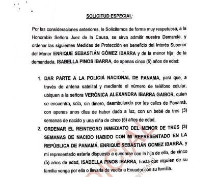 Ante ello, 24 horas más tarde, el padre del menor, Enrique Gómez, presentó un documento para solicitar el “reintegro inmediato al hogar del menor (su hijo)”. En él se expone que Ibarra actúa de manera irracional por posible síndrome de Depresión Postparto.