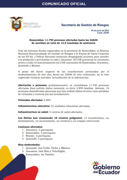 Con corte de las 22h00 del domingo 4 de junio del 2023 Gestión de Riesgos informó que existen 11750 personas afectadas esto corresponde a 2895 familias. Además, existen 16 personas damnificadas, es decir que perdieron sus viviendas y enseres por las inundaciones. No se han registrado víctimas mortales.