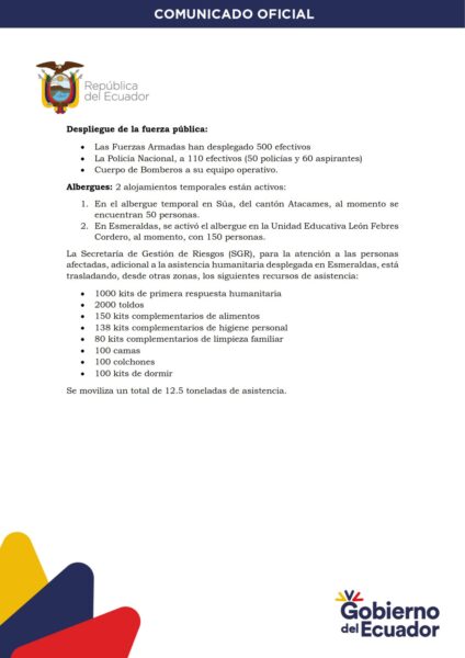 Desde la Secretaría de Gestión de Riesgos se informó también que ya se traslada hacia la provincia 12.5 toneladas de ayuda humanitaria. Entre los recursos se cuentan 150 kits de alimentos, 138 kits de higiene personal, 80 kits de limpieza familiar, 2000 toldos, 100 camas, colchones y kits de dormir.