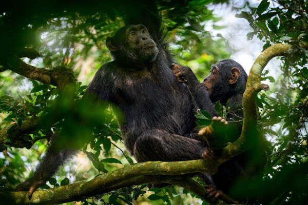 Chimpanzee, Pan troglodytes, on the tree in Kibale National Park, Uganda, dark forest.