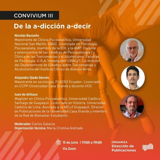 La Universidad Casa Grande tiene el placer de invitarlos al conversatorio CONVIVIUM III ‘́De la a-dicción a-decir’. Este evento es organizado por la Dirección de Publicaciones y se desarrollará el jueves 15 de junio desde las 17:30 hasta las 19:00, a través de la plataforma ZOOM. No te pierdas esta oportunidad de participar en una interesante discusión. Para acceder al conversatorio, puedes utilizar el siguiente enlace: https://casagrande.zoom.us/j/95384346429. La ID de reunión es 95384346429 y la clave de acceso es 71893.