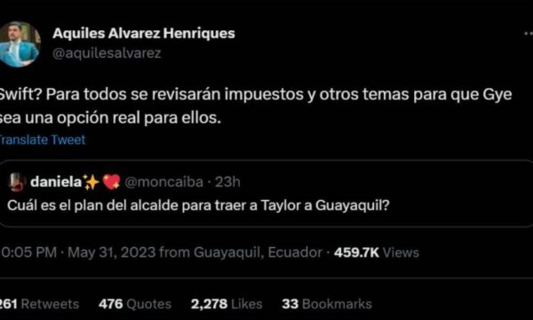 En días pasados la petición de una fanática de la cantante recibió una respuesta “¿Swift? Para todos se revisarán impuestos y otros temas para que Gye sea una opción real para ellos”, escribió Aquiles Álvarez, alcalde de Guayaquil. Con esto hace referencia a los distintos asuntos que revisar para el montaje de espectáculos públicos, como las tasas municipales se puedan dar es esta parte del país.