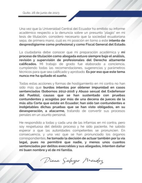 Luego del comunicado emitido por la institución educativa, la fiscal Diana Salazar también emitió un pronunciamiento y señaló que “todas estas acciones y tipos de hostigamiento” solo pretenden “obtener impunidad en casos sentenciados (Sobornos 2012-2016 y Abuso sexual del exdefensor del pueblo)”.