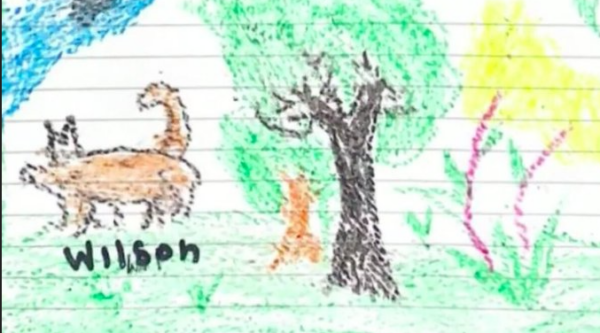En el dibujo que hizo la mayor de los hermanos Mucutuy, Lesly, se ve al can junto a un río lleno de peces, un árbol, flores amarillas y el sol alumbrando su camino. Lo que plasmó Soelini es parecido. Ahí se ve nuevamente al perrito junto a un árbol, una flor y bajo un sol resplandeciente. A un lado está la bandera de Colombia y se lee el mensaje “Siempre bendecida”.