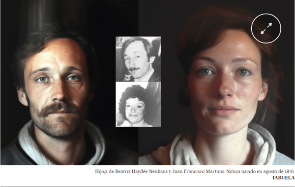 Con @IAbuelas, Barros ha podido recrear cómo se verían esos niños robados hoy. En la mayoría de los casos, publica retratos de varones y mujeres, sin certezas sobre fechas o géneros. En otros, tiene más datos. Barros ha podido imaginar cómo se verían personas como Clara Anahí Mariani, que el próximo 12 de agosto cumpliría 47 años, gracias a los retratos disponibles de sus padres. Clara Anahí fue secuestrada cuando tenía poco más de tres meses. Hija de Diana Teruggi Daniel Mariani, nació el 12 de agosto de 1976, y fue la única sobreviviente del ataque en su casa que mató a su madre y a otros cuatro militantes de Montoneros, el brazo armado del peronismo. La fotografía que le tomaron cuando era una bebé es una de las grandes postales de esa época trágica.