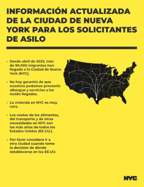 Los mensajes escritos son rotundos: «La vivienda de Nueva York es muy cara»; «No hay garantía de que nosotros podamos proveerle albergue y servicios»; «Los costos de alimentos, transporte y otras necesidades en Nueva York son los más altos de todo Estados Unidos».