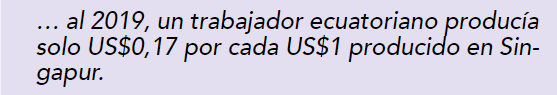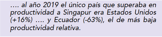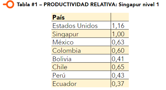 La tabla nos muestra que al año 2019 el único país que superaba en productividad a Singapur era Estados Unidos (1,16). México (0,63) tenía una productividad que equivalía a dos tercios de Singapur. Colombia y Chile aproximadamente igual que México. Bolivia 41%, Perú 43% y Ecuador 37%, el de más baja productividad relativa.