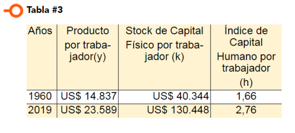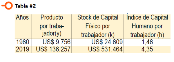 Estemos claros, esto nos dice que Singapur al cabo de 59 años (de 1960 a 2019), produce 14 veces más por trabajador (en dólares), dispone de 21 veces más capital físico por trabajador (pensemos en más maquinaria con su tecnología) y la “capacitación” de su gente es 3 veces mayor. Esto equivale a un crecimiento anual del 4,59% del producto, 5,36% anual del capital físico y del 1,87% anual del capital humano.