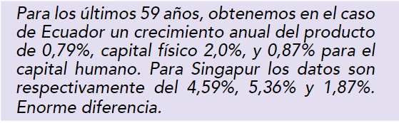 Con estos datos se deriva un crecimiento anual del producto de 0,79%, capital físico 2,0%, y 0,87% para el capital humano. Recordemos que para Singapur los datos eran respectivamente del 4,59%, 5,36% y 1,87%. Así el crecimiento interanual de la productividad en Ecuador entre 1960-2019 sería igual a g = -0,45%. Este dato podría ser deficiente, dado que la medida de crecimiento del stock de capital podría estar afectada por malos registros debido a la corrupción y poca transparencia. Sabemos que en países en vías de desarrollo la medida de “robo o despilfarro” de recursos en obra pública fluctúa entre el 25% y el 43% del registro en formación bruta de capital fijo. (Weil cita los estudios de Prichett al año 2000).