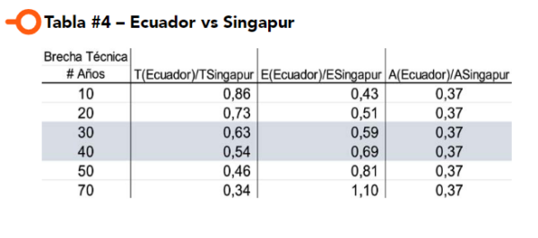 En la medida que el número de años de retraso tecnológico de Ecuador sea mayor a 20 años (primera columna), el cociente T(Ecuador)/T(Singapur) disminuiría (segunda columna), por ejemplo, si las tecnologías de Ecuador tuvieran 70 años de atraso contra Singapur, el cociente sería 0,34, es decir, el nivel tecnológico de Ecuador equivaldría al 34% del nivel de Singapur. Hay que recordar que con 20 años era equivalente al 73%. Es comprensible, cuánto más retrasadas las tecnologías peor nivel tecnológico (como dijimos 1% de pérdida anual aproximadamente).