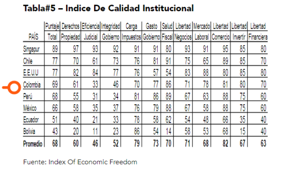 En derechos de propiedad: Perú, México, Ecuador, y Bolivia, tienen puntajes, por debajo del promedio. En eficiencia judicial: los peores puntajes los comparten los países ya referidos, y se suma Colombia. En integridad gubernamental (corrupción): repiten los mismos, es decir todos los latinoamericanos analizados, con la excepción de Chile. En gasto de gobierno: Estados Unidos, Ecuador y Bolivia, obtienen puntajes por debajo del promedio. En salud fiscal, los mismos. En libertad para emprender negocios: Perú, México, Ecuador, y Bolivia, con desempeños por debajo del promedio. Estos serían los indicadores de eficiencia en los cuales los latinoamericanos comparten los peores puntajes.