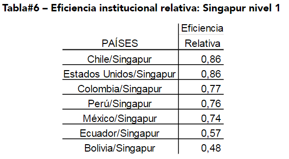 En función de los puntajes obtenidos, en la columna 2 (puntaje total), el líder de este grupo de países es Singapur. Chile y Estados Unidos comparten el segundo lugar. El resto de los países de América Latina ocupan los últimos lugares, siendo Ecuador y Bolivia los países más ineficientes del conglomerado.