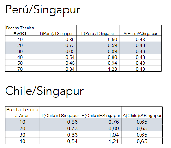 En el caso de Perú, el número de años que permite igualar los cocientes relativos a Singapur de tecnología y de eficiencia, y generar una productividad relativa de 0,43 estaría entre 20 y 30. El caso de Bolivia es similar al de Perú.