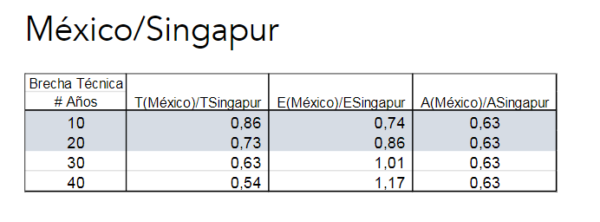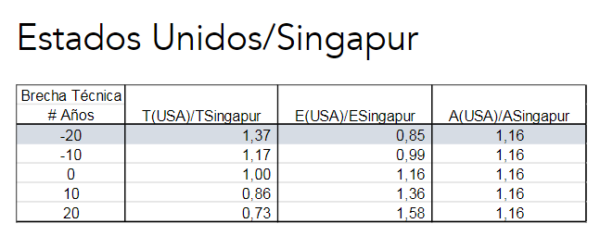 Conclusión: dados los supuestos, tenemos frente a Singapur, 27% de atraso en tecnología, 63% de atraso en productividad y 49% de atraso en eficiencia.