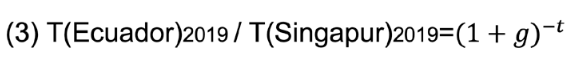 Tomando g = 1,57%, la tasa de crecimiento de la productividad de Singapur entre 1960 y 2019, y asumiendo que este crecimiento se debe enteramente a mejoramientos tecnológicos, y que el retraso tecnológico de Ecuador contra Singapur es de 20 años, la definición (3) genera: