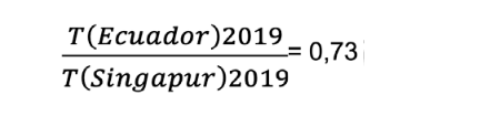 En el caso de Ecuador, ya teníamos una productividad relativa a Singapur de 0,37(al año 2019), que complementamos con la información de la tabla número seis, que nos muestra un cociente de eficiencia relativa de 0,57, por lo tanto, reemplazamos en la definición: