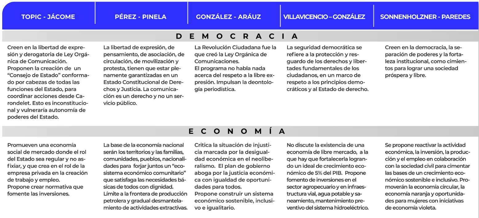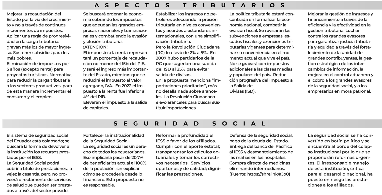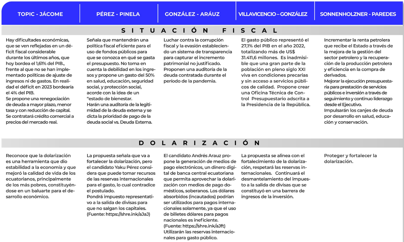Este artículo busca dar una visión crítica de las propuestas de estos cinco binomios con más opciones de resultar elegidos a través del proceso electoral, tomando en cuenta los problemas más acuciantes en la sociedad ecuatoriana: inseguridad ciudadana; empleo y reducción de la pobreza; situación económica compleja (fiscal, dolarización, deuda, crédito); salud pública; seguridad social y educación. Sobre algunos aspectos de los programas se presenta a continuación un cuadro comparativo. Luego, hay un desglose de temas clave en los programas de gobierno presentados por las distintas candidaturas.