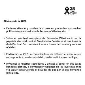 A través de un comunicado, la organización política pidió silencio y prudencia a «quienes pretenden aprovechar políticamente el asesinato» del político de 59 años. Además, dijo que sobre el eventual reemplazo de Villavicencio en la papeleta electoral la decisión solo será tomada por Construye y se comunicará en sus canales oficiales.