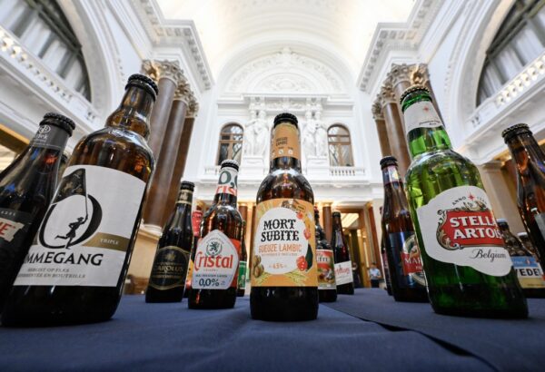 Beer bottles are displayed inside the Belgian Beer World, the world’s largest interactive experience center dedicated to beer, newly opened in the renovated stock exchange building “La Bourse/De Beurs” in Brussels on September 7, 2023. (Photo by JOHN THYS / AFP)