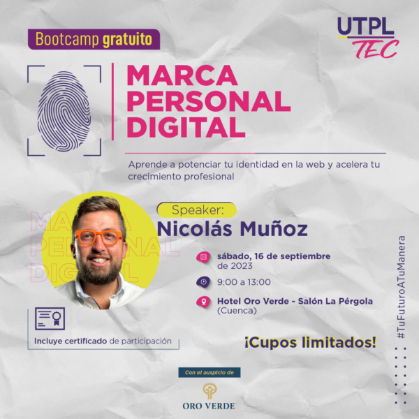 Para responder a estos nuevos retos y oportunidades, la Unidad Académica de Formación Técnica y Tecnológica UTPL TEC, a través de su oferta actual en Comunicación Estratégica y Marketing Digital y Transformación Digital de Empresas, y el apoyo del Centro Regional Cuenca desarrollarán el Bootcamp “Marca personal digital” en las instalaciones del Hotel Oro Verde de la ciudad de Cuenca.