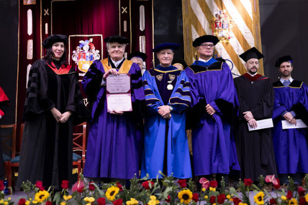 De izq. a der. Andrea Encalada, vicerrectora USFQ, Bruce Hoeneisen, profesor emérito USFQ, Carlos Montufar, presidente USFQ, Diego Quiroga, rector USFQ, durante la Quincuagésima séptima Ceremonia del Comienzo Clase 2023.