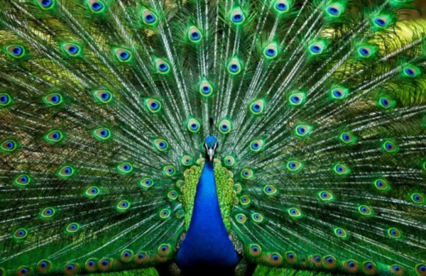 Pavo real (Pavo cristatus), específicamente el macho de la especie, famoso por su impresionante exhibición de plumas iridiscentes en la cola. Con sus vibrantes tonos de azules, verdes y toques de otros colores que brillan con la luz, estas aves son un verdadero espectáculo.